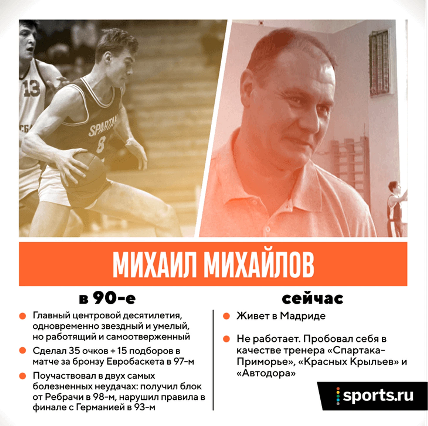 Век Youtube представляет баскетбол 90-х в странной плоскости: для Михаила Михайлова он свелся по сути к одному моменту, который и без того стоит у всех перед глазами – российский центровой получает мяч под кольцом от Панова и уже несет забивать сверху, но натыкается на железную руку Желько Ребрачи. Фантастический блок-шот перечеркнул надежды российской сборной на золото чемпионата мира и навсегда оставил чувство досады. И вот теперь еще предательски исказил карьеру Михайлова.