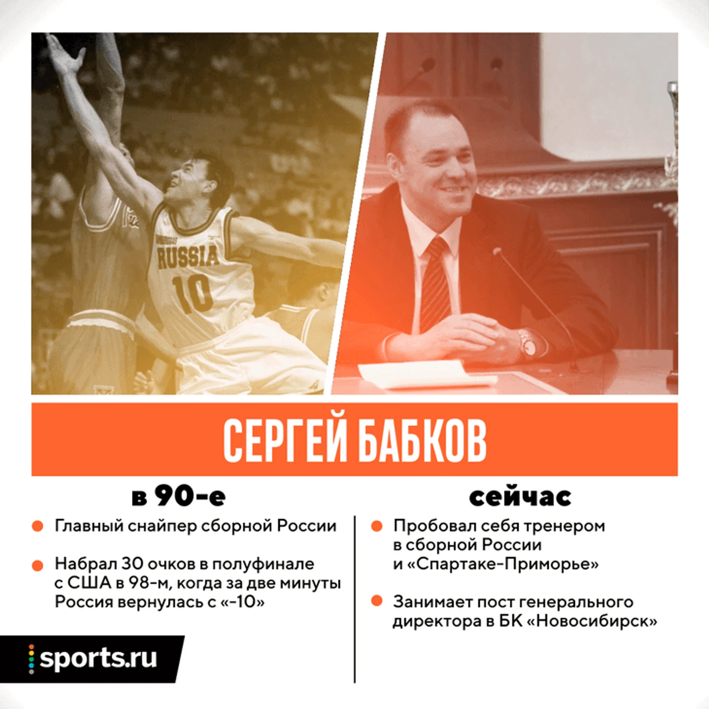 Сергей Бабков – главный снайпер сборной 90-х, обладатель золотой руки и невиданного хладнокровия. В 94-м, когда на слуху был смертоносныйй бросок Реджи Миллера, защитник все равно оказался замечен: из скромного «Трира» Боб уехал в Испанию, где и провел остаток карьеры – без лишних волнений и нервотрепки, в провинциальной, но сильной команде лучшего чемпионата, на ведущих ролях. Абсолютно таков же Бабков был и в национальной сборной – он не лез на первый план, а просто делал свое дело и нес нелегкое бомбардирское бремя. Иногда ситуация требовала уйти в тень и дать разыгрываться другим, иногда соперники получали от Боба по 20-30 очков. Нужно было встать на линию в финале Евробаскета – пожалуйста. Забить важнейший трехочковый – и снова да.