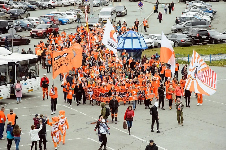 Фан-сектор УГМК устроил массовую оранжевую акцию – громогласный проход по центру города к ДИВСу для поддержки команды в первом трофейном матче сезона. К нему присоединились не только болельщики уральской команды, но и просто любители крутых мероприятий.