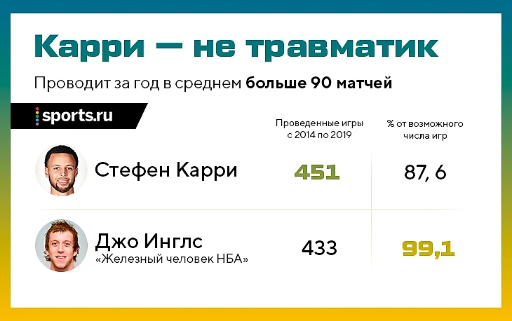 И с клуба в целом. Чтобы попасть в плей-офф, всему «Голден Стэйт» нужно было очень неслабо напрячься: Карри – регулярно выдавать что-то героическое при отсутствии хоть сколько-нибудь квалифицированного фона (он даже на старте не мог это делать), Клэю Томпсону – непременно вернуться как можно раньше, чтобы спасти сезон, Грину и Расселлу – взвалить на себя по максимуму, так как больше просто некому.
