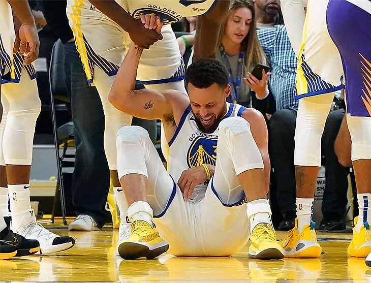 В матче с «Финиксом» лидер «Уорриорс» пытался облететь центрового Арона Бэйнса, но упал на паркет. А тот рухнул на его руку сверху.