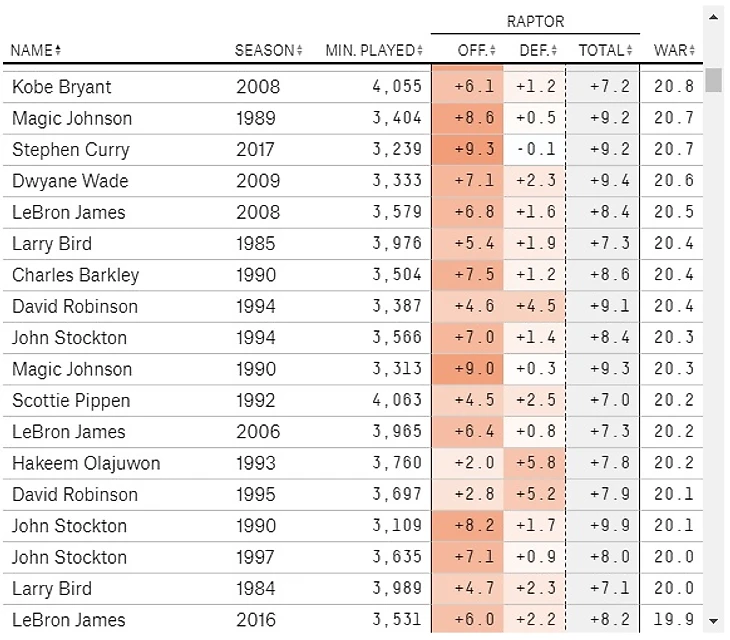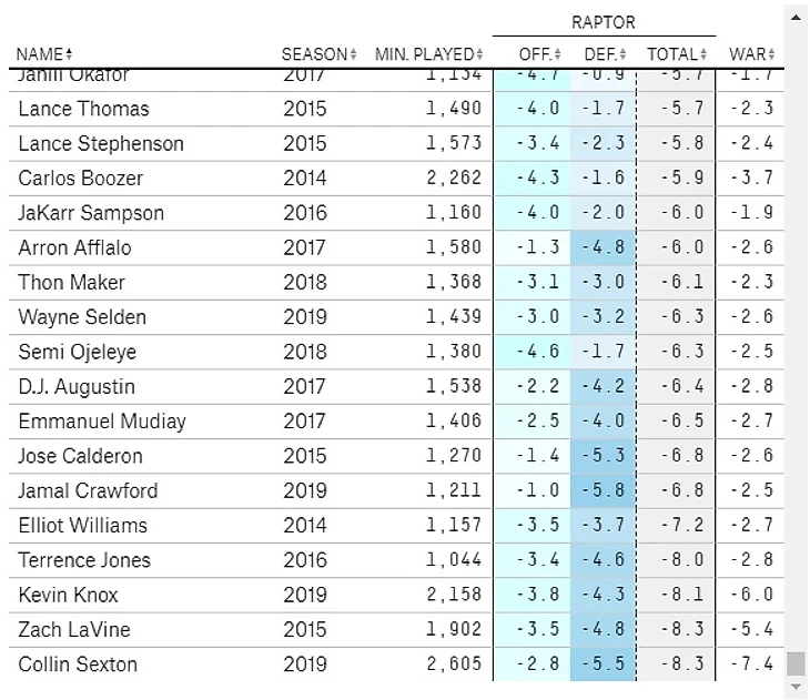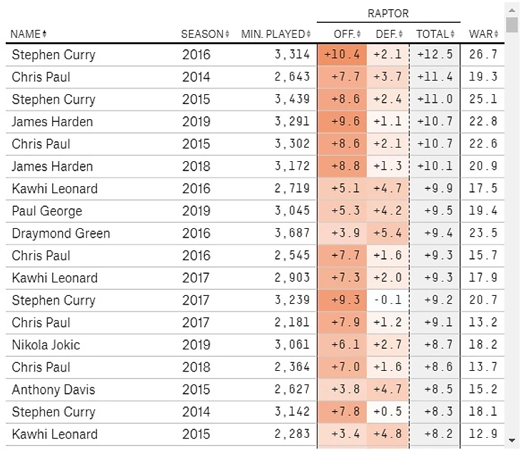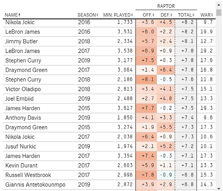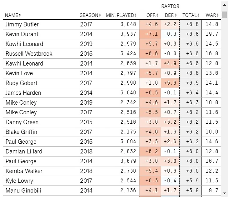 Команды НБА высоко ценят пресловутое движение игроков и мяча («floor spacing» или просто «спейсинг» ), игру в обороне и созидание в нападении, и они относительно мало ценят навыки традиционных бигменов. РАПТОР оценивает эти вещи схожим образом – не потому, что стояла какая-то преднамеренная задача спроектировать систему подобным образом, а потому, что важность этих навыков естественным образом вытекает из полученных данных. РАПТОР считает таких доминирующих боллхэндлеров, как Джеймс Харден и Стэф Карри, феноменально хорошими. Он высоко ценит двусторонних вингов, таких как Кавай Леонард и Пол Джордж. Могут сложиться амбивалентные отношения с центровыми, которые зачастую переоцениваются другими статистическими системами. Но РАПТОР высоко ценит таких современных центровых, как Никола Йокич и Джоэль Эмбиид, так и оборонительных колоссов вроде Руди Гобера.
