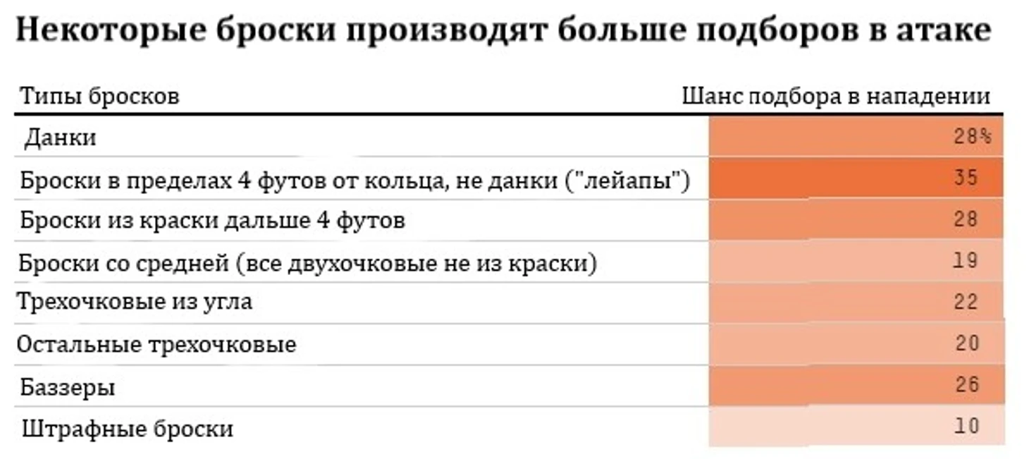 Подборы в нападении: Подборы в нападении – сложная категория. С одной стороны, ценность такого подбора априори довольно высока: команда не только дает жизнь еще одному своему владению, но и зачастую получает превосходную диспозицию для броска (например, путбэк-данка). С другой стороны, в подборе очень многое связано с тем, что нужно быть в нужное время и в нужном месте. Подбор должен учитывать значительную долю удачи, а если игрок будет слоняться без дела под кольцом в ожидании подбора, это может негативно сказаться на спейсинге команды. Но в целом подборы в нападении становятся более ценными, так как их доля неуклонно снижается, упав с 33% от общего числа подборов в середине 1980-х до примерно 23% в нынешней НБА.