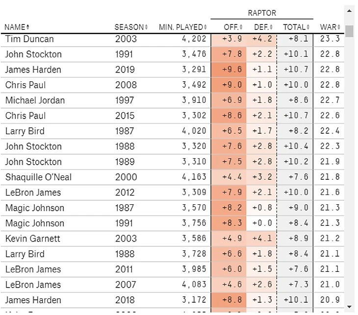 Несмотря на то, что сезон 2008/09 в исполнении Леброна Джеймса является лучшим сезоном в истории по версии РАПТОР (+12.6 по Приблизительному РАПТОРу на 100 владений), именно Майкл Джордан доминирует в рейтинге по WAR, потому что он получал тонну свободного времени и делал все то, что обожает РАПТОР: создавал броски, играл в защите и тому подобное. На самом деле, если смотреть на РАПТОР, то можно убедиться, что пик Джордана был немного выше пика Леброна. Но, оставим этот спор для следующей статьи, и лучше обратим внимание на то, как РАПТОР относится к таким игрокам, как Джон Стоктон (любит) и Патрик ЮИНГ (ненавидит). Для получения более подробной информации о Приблизительном РАПТОРе вы можете ознакомиться с данными файлами, которые содержат рейтинги каждого игрока в регулярном сезоне и плей-офф по-отдельности, или с версией, которая объединяет эффективность игрока в течение всего сезона.