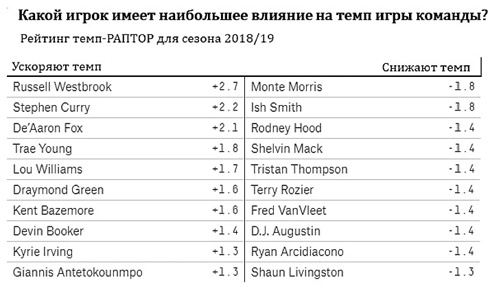 Уэстбрук больше прочих игроков влиял на темп своей команды в сезоне 2018/19, ускоряя темп «Тандер» на 2.7 владений за 48 минут, в то время как Монте Моррис приложил максимум усилий, чтобы замедлить игру «Наггетс».