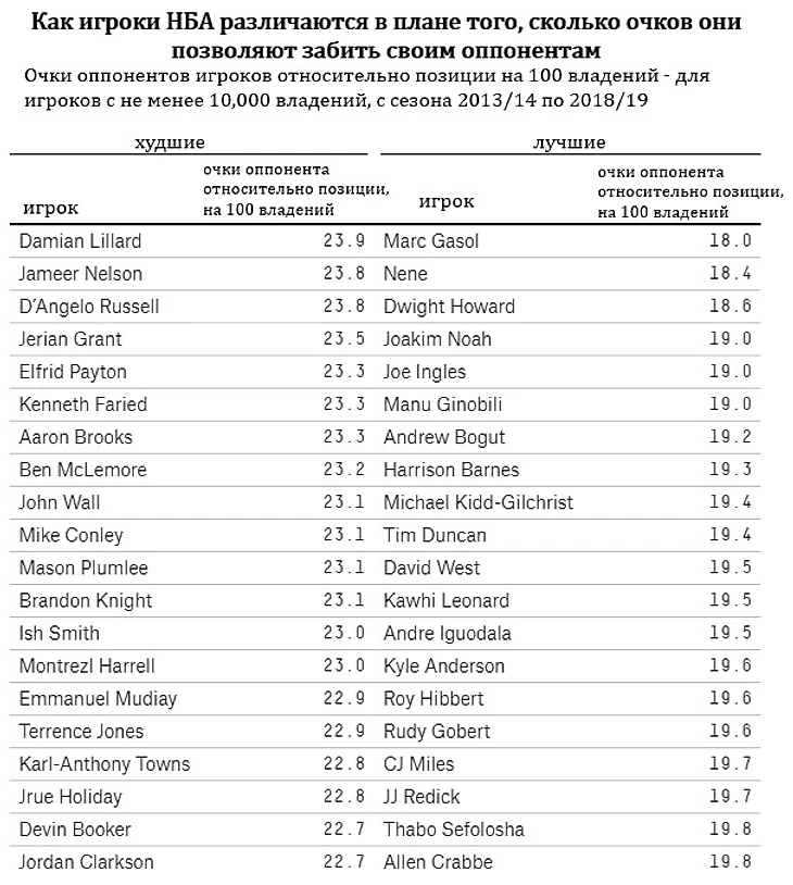 Перехваты: перехваты – пример того, как оборонительная метрика может служить как прямой, так и косвенной мерой ценности игрока. В нашем оборонительном RAPM перехват стоит 1.49 очков. Это почти наверняка больше той прямой ценности, которую обеспечивает перехват, поскольку среднее владение в НБА оценивается около 1.08 очков, а это означает, что стоимость завершения соперника владения перехватом, вероятно, не стоит много больше тех самых 1.08 очков. Тем не менее, перехваты также являются вехой общей оборонительной активности, некоторые показатели которой в настоящее время остаются неизмеримыми.