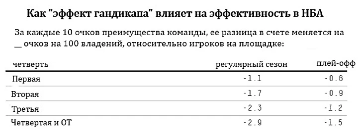 Если кто-то из читателей почтенного возраста и помнит игру NBA Jam, то вы явно не забыли о так называемом «эффекте гандикапа» (а может быть вы фанат футбольной FIFA) – компьютер помогал команде, которая проигрывала с существенной разницей, волшебным образом заставляя попадать ее чаще. Оказывается, похожий эффект есть и в реальной НБА! Относительно игроков, имеющихся в составе, команды играют значительно хуже, когда имеют большой отрыв, и значительно лучше – когда уступают в счете с большой разницей. Эти тенденции, которые можно назвать «эффектом гандикапа», имеют глубокие последствия. Когда команда проигрывает 20 очков, то статистически она должна набрать примерно на 6 очков на 100 владений больше, чем если бы счет был равным – это как заменить средненького игрока вашей команды Леброном.