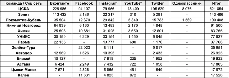 По сравнению с футбольной таблицей, добавил колонку «Итог», в которой указана сумма подписчиков. Соответственно клубы расставлены в по убыванию итогового показателя, чтобы было удобнее сравнивать общее положение дел.