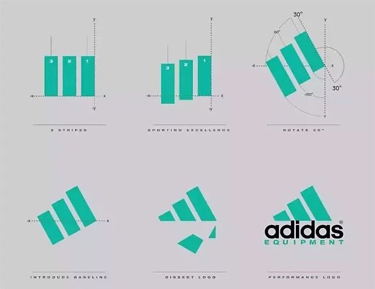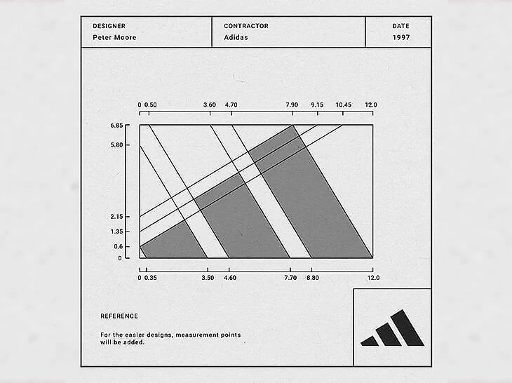 В 1990 году Мур создал логотип EQT. Питер использовал три полосы, с которыми ассоциируется классический дизайн adidas из 50-х, выстроил их лесенкой (призовые места на соревнованиях), развернул и обрезал лишнее.