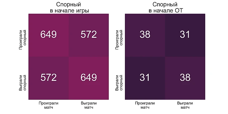 Неопытный любитель статистики (совсем как я) наверняка воскликнет на этом месте: «Победа в стартовом спорном позволяет дополнительно выигрывать 6% матчей! А в овертайме — целых 10%!!!»