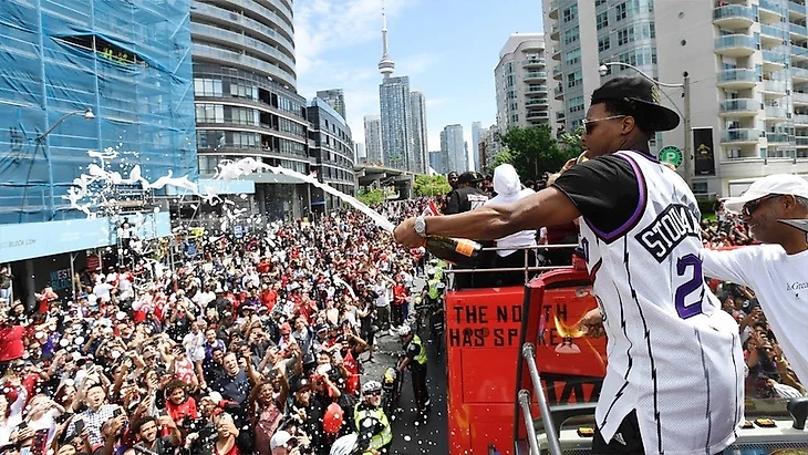 Чемпионский парад в Торонто. Кайл Лаури поливает толпу шампанским.