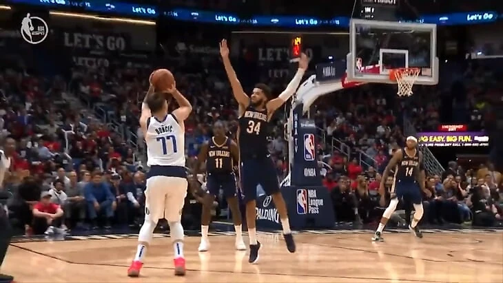 Вот критерий – кисть на мяче сбоку во время ведения. Арбитры это разрешают, а значит, такое положение руки является допустимым. Обратный кроссовер – и это последний удар в пол. Дальше только шаги. Кисть расположена на мяче так, как рефери разрешают держать ее во время дриблинга. Опорная нога, при этом, поменялась c левой на правую. Следует разрыв дистанции с защитником широким отшагиванием по диагонали и одновременно вторая рука оказывается на мяче. Дальше можно сделать еще целый шаг по правилам. Дончич его делает и бросает.