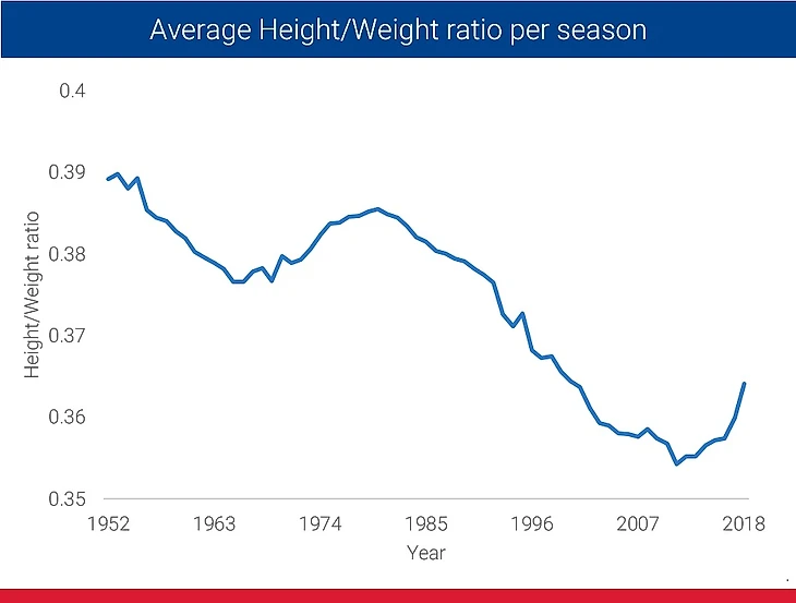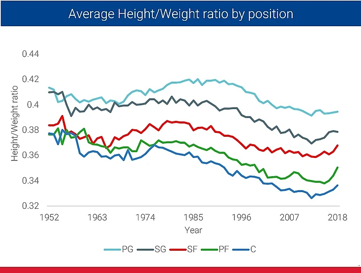 Касаемо соотношения роста и веса: новые требования к скорости и ловкости игроков, особенно бигменов, бросаются в глаза: новички С и PF имеют самый высокий коэффициент соотношения роста и веса за последние 28 сезонов. В 2017/18 гг они были практически равны между собой в данном показателе и стали наиболее близки к SF и SG за последние 20 лет.