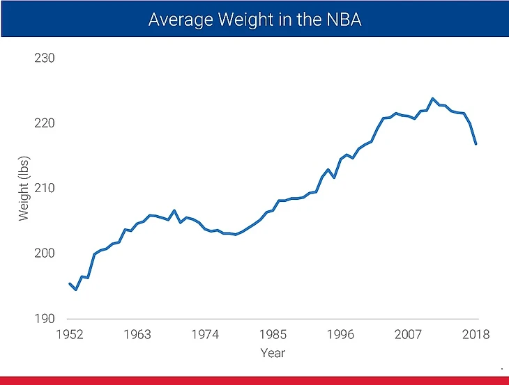 Приведённая ниже диаграмма отражает эволюцию требований к атлету НБА. Начиная с 80-х, когда средний рост достиг максимального показателя, средний вес стал постоянно увеличиваться, поскольку игроки становились физически сильнее, чтобы оставаться конкурентоспособными в игре, которая предъявляла всё возрастающие требования к спортсменам.