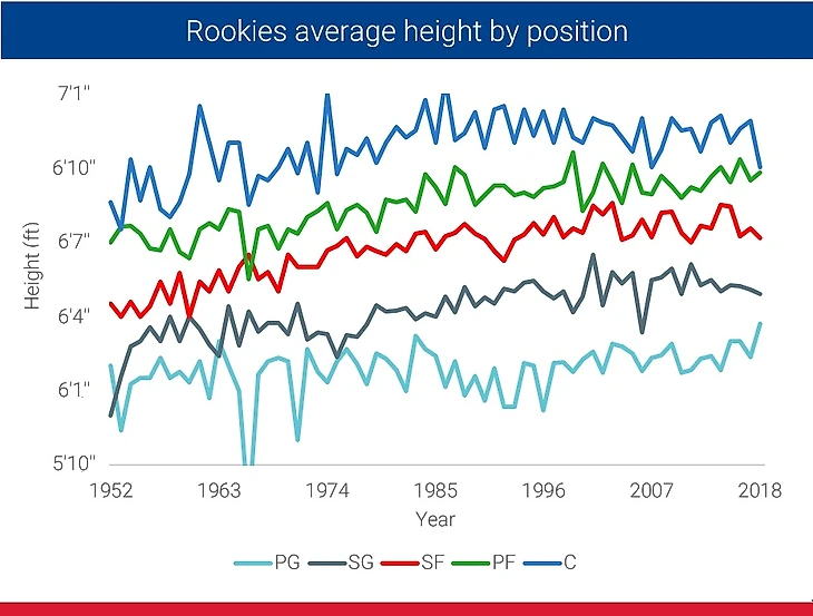 Данные по новичкам сильно колеблются от года к году, но они достаточно точно отражают перемены в Лиге. Так, центровые никогда не были ниже за последние 44 года. В сезоне 2017/18 новички на позициях С и PF имели практически одинаковый средний рост. Такого не происходило никогда ранее. С другой стороны, PG никогда не были выше.