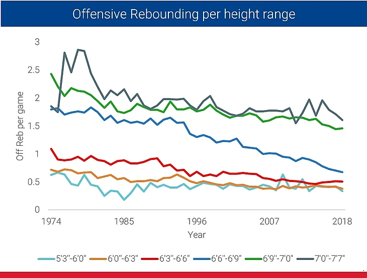 С каждым годом в лиге сокращается число подборов в нападении. При этом средний рост совершающих такие подборы всё больше отклоняется от среднего роста в целом. Другими словами, только баскетболисты выше 6.9 сохраняют высокий уровень ORB, в то время как доля остальных игроков снижается.