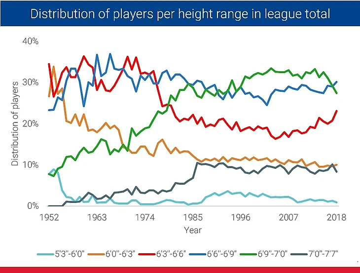 Если посмотреть на диапазон роста в историческом масштабе, то складывается впечатление, что мы возвращаемся к 60-м и 70-м годам, когда число игроков условно «среднего роста» в Лиге было преимущественным.
