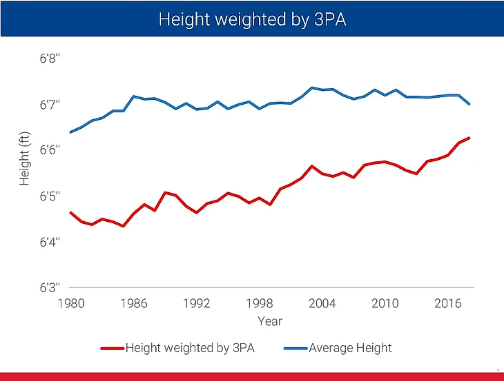 Вместе с тем, хотя средний рост за последние три десятилетия и остаётся примерно на одной отметке, произошло немало интересных изменений в различных его соотношениях и, соответственно, игровом стиле. Например, разница между C и PG в прошлом сезоне (2017/18 гг – прим. пер.) была самой низкой за последние 42 года, уменьшившись на 10% только за последние 3 сезона.