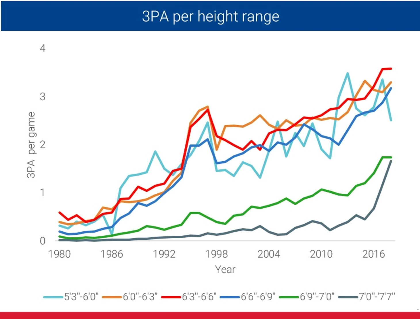 С момента введения трёхочковой линии в сезоне 1979/80 в распределении дальних бросков произошли существенные изменения. Вначале это была привилегия исключительно невысоких игроков. Но затем высокие парни постепенно адаптировались и тоже начали использовать атаковать из-за дуги. Поэтому изначально соотношение таких попыток с ростом не было близким, но в последние сезоны наблюдается тенденция к сокращению разрыва.