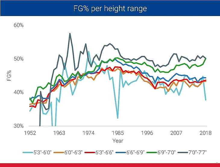 В НБА игроки ниже среднего роста исторически получали больше попыток, чем бигмены (сейчас эта тенденция снижается). С другой стороны, высокие игроки в среднем атаковали с более высоким процентом. Разница в проценте с игры между игроками выше 6.9 и остальными неуклонно росла с 80-х годов. Особенно это стало заметно в последнее десятилетие – в сезоне 2017/18 она вышла на исторический уровень