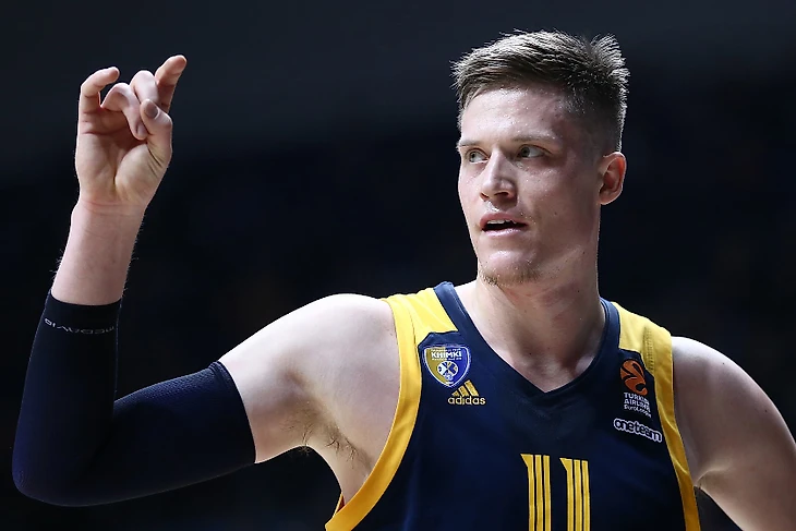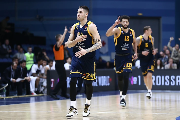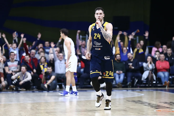 Стефан Йович своим трёхочковым попаданием выбивает на табло сотню.