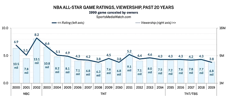 Из года в год интерес к Матчу всех звезд неуклонно снижается. Подтверждают это не только общее впечатление и всевозможные опросы, но и телевизионные рейтинги, существенно не поднимавшиеся уже на протяжении десятка лет.