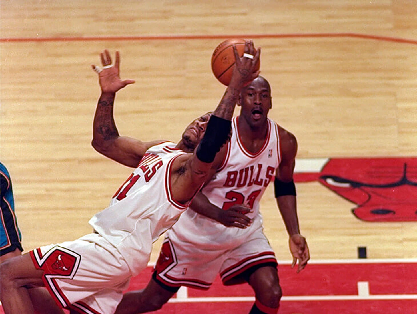 Еще один великий оборонец – Деннис Родман. Но его защитная игра была полной противоположностью игре Хакима – там, где Оладжувон брал силой, ловкостью и предвосхищением событий, Родман выцарапывал жесткостью, цепкостью и надоедливостью.