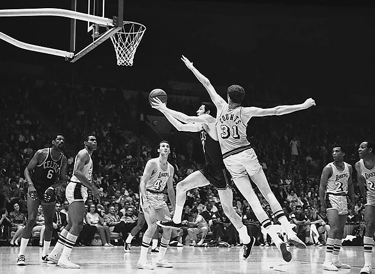 В-третьих, в любом случае нужно делать скидку на уровень лиги – не потому что «в те годы играли только белые уборщики ростом 175 см», вот это настоящая спортивная ересь; а потому что Расселл был первой доминирующией защитной угрозой в истории, и баскетбол просто не знал похожих примеров и не понимал, как при таком разрушителе эффективно атаковать.