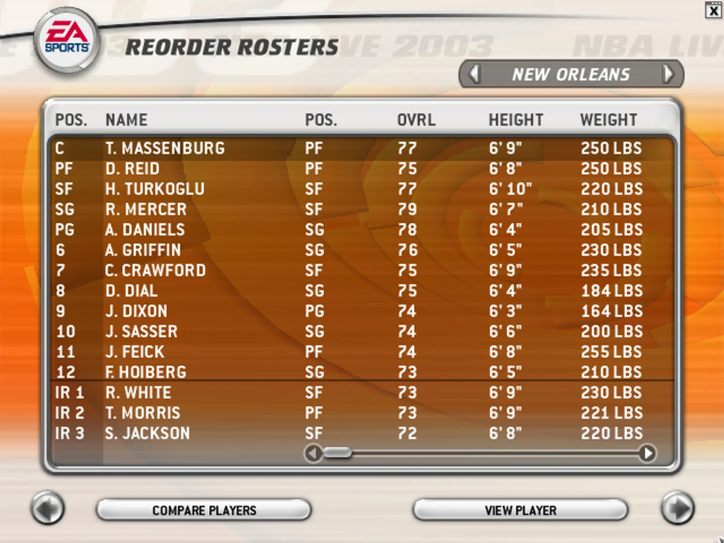 Не хочу брать игроков с неистекающими контрактами больше 100 пунктов (ах да, в NBA Live 2003 не зарплаты, а баллы – 1 млн в платежке на всю команду, 300 тысяч – максималка, 30 тысяч – минималка) – прохожу мимо Эрика Дампьера и Бревина Найта.