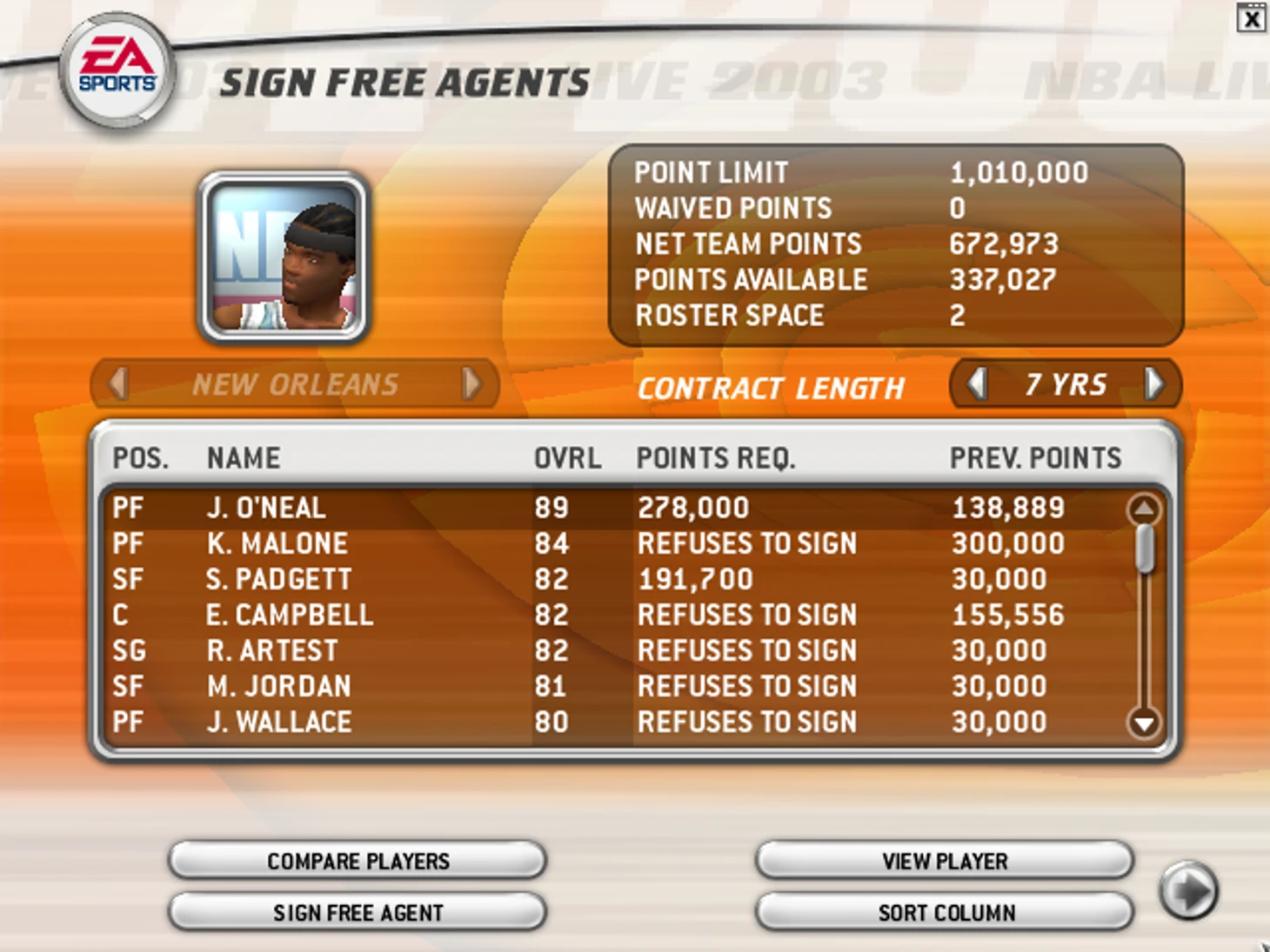 Не знаю, почему JO захотел в команду расширения, может, всегда хотел жить в Новом Орлеане. Даже Карл Мэлоун, который родом из Луизианы, был бы логичнее. Но отказываться от такого подарка игры точно не стану. Конечно, я трачу на О’Нила почти все свободные деньги, от меня уходят все мои центровые и Антонио Дэниэлс (у него все равно упал рейтинг и он уже хуже Хуана Диксона, я бы не стал его сохранять).
