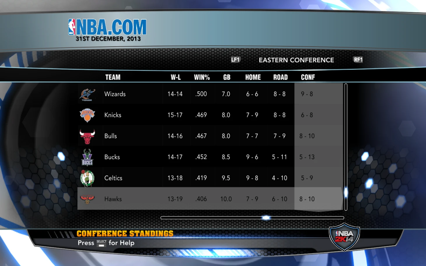Но дальше дело пошло лучше, и взяли все 4 матча, причем 3 у непосредственных конкурентов. С Кингз(12-8) и Рокетс(8-14) проблем не возникло. У Рокетс стрик уже из 6 поражений подряд. Перед бэк-ту-бэком с Мишками(13-7), стали доступны Пиппен и Райс, но я решил ими не рисковать до домашнего матча с Кливлендом(7-14).