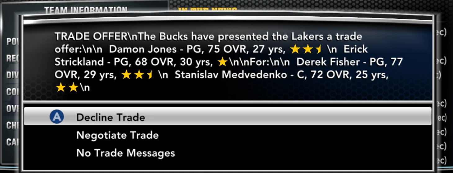 Как и говорил, недовольных ребят начали пытаться менять. От Сан-Антонио(11-10), у которых кстати только-только вернулся Паркер, прилетело предложение Малика Роуза(78) и Джейсона Харта(68) на Фишера(77) и Райса(65). Позиция фронткорта у меня укомплектована, а Харт на Фишера это явно не выгодно.