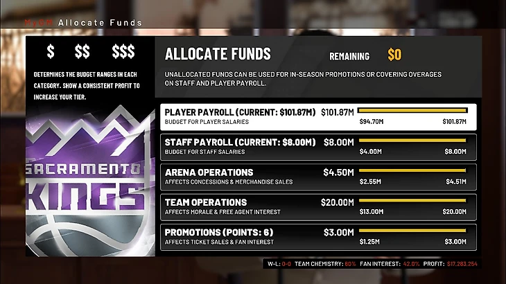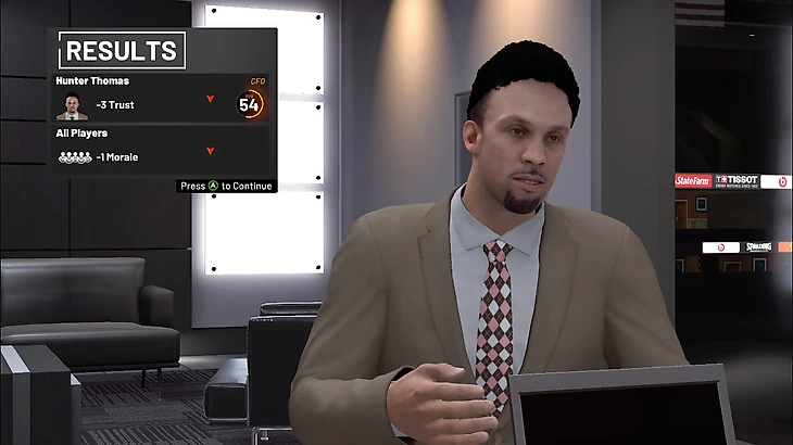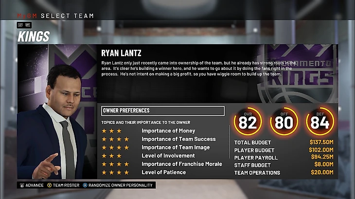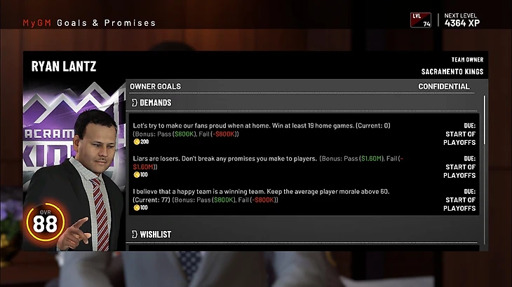 Владелец команды будет ждать нас в своем кабинете для стартового напутствия и целей для вас. Вы менеджер и вам решать все проблемы клуба, несмотря на то, что Вы только вступили в должность. Вот какие перед нами стоят задачи: выиграть как минимум 19 игр дома, не нарушать обещаний, данных баскетболистам, сохранять общий уровень морали игроков не ниже 60, собрать два лотерейных пика драфта и быть в топ-10 лучших клубов по посещаемости.