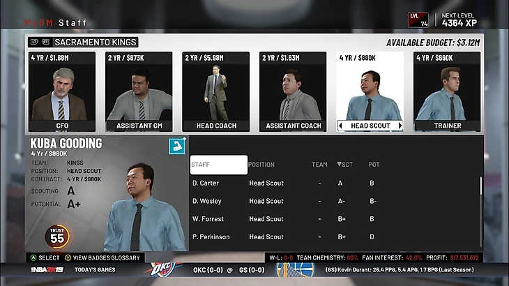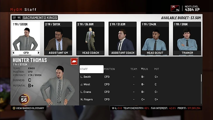 В этом же разговоре с владельцем он может познакомить нас с персоналом. Всего 6 основных лиц: директор по финансовым операциям или же просто CFO, ваш ассистент, главный тренер команды, ассистент главного тренера, скаут и тренер по физподготовке и, по совместительству, доктор. Каждый член команды имеет свои характеристики. Ваш ассистент, к примеру, должен уметь заключать контракты с игроками и выгодно совершать обмены. У каждого сотрудника есть показатель потенциала. При хороших отношениях и высоком потенциале, будут улучшаться их навыки, а также появляться дополнительные способности – перки. Они могут быть положительными или отрицательными. Скауты бывают ленивыми или привозят неточную информацию с просмотров, а могут выискивать темных лошадок драфта или работать настолько усердно, что соберут данные на большее количество баскетболистов. Иногда попадаются работники с хорошими характеристикам, но ужасными перками. Именно Вам нужно решить, оставить в команде вредного, но профессионального, или нанять неопытного, но перспективного служащего.