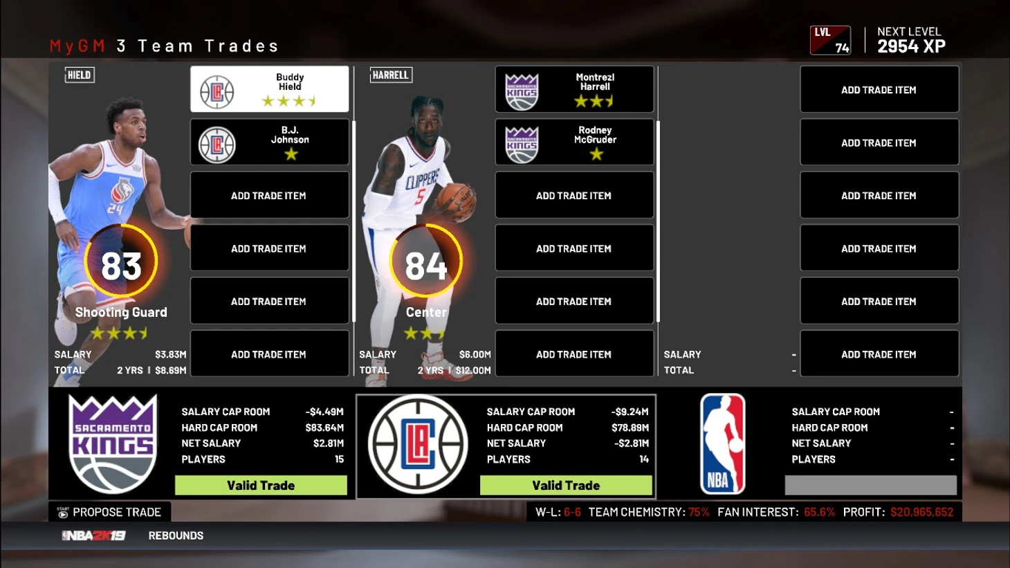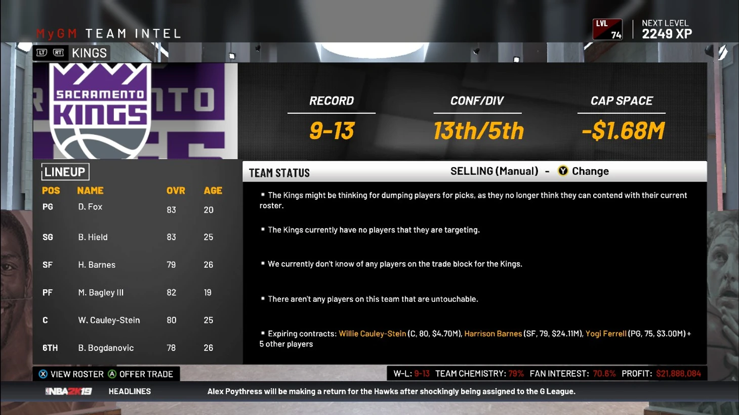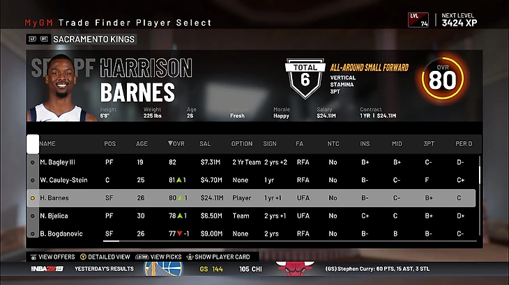 Доиграл я до 10 ноября и перед встречей с Озерниками, мне предложили интересный обмен: Хилда и одного хилого новичка на Монтреза и МакГрудера. Теперь расскажу, почему я задумался. Монтрез очень классный центровой для своего возраста. Колли-Стайну 25, а Монтрезу 24, а также по рейтингу, характеристикам и значкам Хэррел лучше. Если же я отдам Хилда, то у меня будет простор для развития Богдановича, который, кстати, немного улучшил свою игру. Но если я соглашусь на этот трейд, то будет проблема с центровыми и нужно будет куда-то деть Джайлса и Стайна. Стайн с уверенностью станет шестым игроком, но вот Джайлза хотелось бы развивать. Поэтому я лучше останусь с Хилдом, чем с 4 центровыми в команде.
