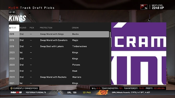 Хотел бы я еще поговорить про драфт-пики, потому что внезапно обнаружил, что на 2019 год у меня 3 пика второго раунда и ни одного пика первого раунда. Поэтому нужно приступать к решительным действиям по обмену пиков.
