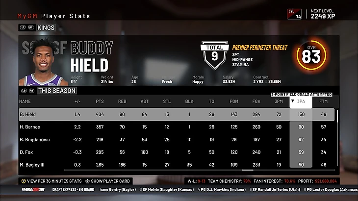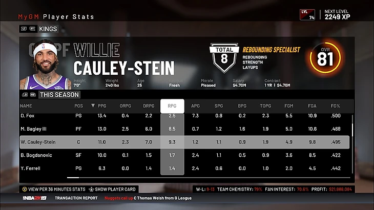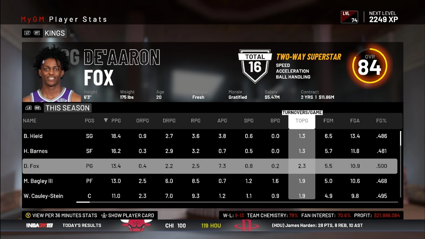 На момент 15 ноября, команда имеет результат 7 побед и 7 поражений. Идем тем же темпом. Игра Фокса остается прежней, что меня уже не радует. Возможно, стоит ему прибавить немного минут, дать больше простора. Богданович прибавляет и становится лучше с каждой игрой. Посмотрю до конца ноября что с ним случится, а там уже и в стартовый можно переводить. Что же до остальных, все так же, как и было до этого. Бьелица-молодец, Фаррел и Мэйсон неплохи, иногда даже Фаррел обгоняет по результативности Фокса.