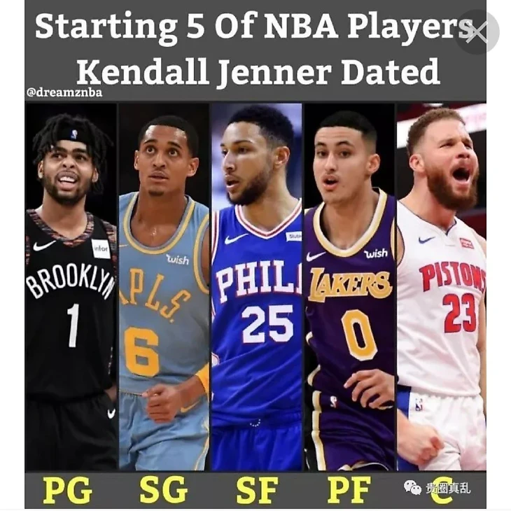 Летом 2019 года пользователь под ником @knicks_tape99 поделился фото, на котором изображены пять баскетболистов, с которыми по его мнению, встречалась Кендалл. На снимке можно увидеть: Бена Симмонса(баскетбольный клуб «Филадельфия Севенти Сиксерс»), Блейка Гриффина («Детройт Пистонс»), Джордана Кларксона («Кливленд Кавальерс»), Кайла Кузму («Лос-Анджелес Лейкерс») и Д’Анджело Рассела («Голден Стейт Уорриорз»).