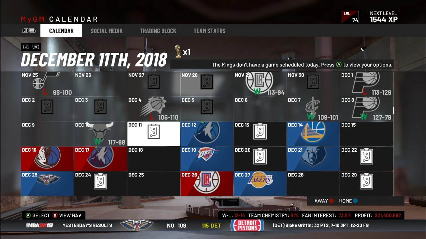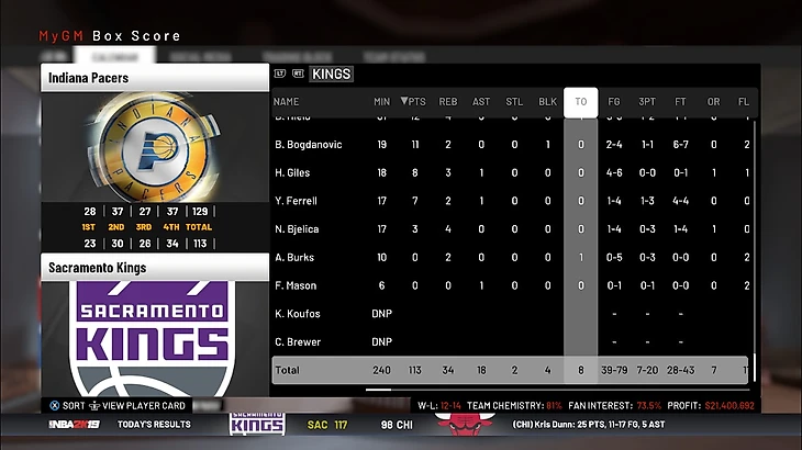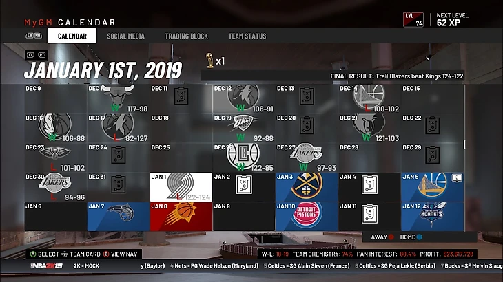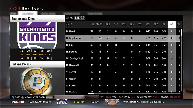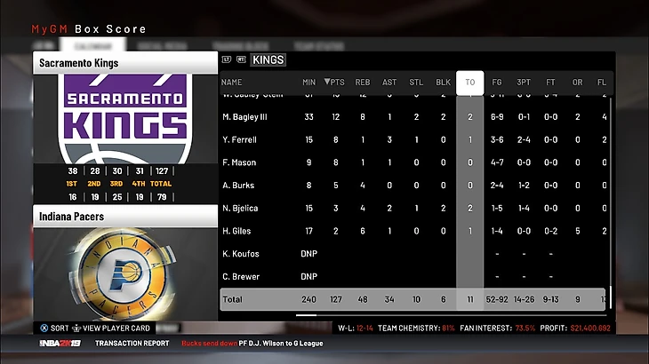 Подведем итоги декабря. Команда заиграла немного лучше, чем раньше, а значит схема себя оправдала. Пока что мы не можем определиться с направлением команды. Думаю, пока не стоит углубляться ни в перестройку, ни в усиление состава на плей-офф. Пока что нужно посмотреть кто будет развиваться и от этого строить команду. По крайней мере, можно будет набирать плохие контракты и рассчитывать на межсезонку 21 года. Сейчас результат команды удовлетворяет, по экономике идем в плюс, так что Сакраменто встречает Новый 2019 год с позитивной стороны.