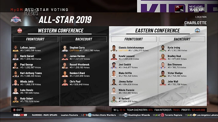 Началось голосование на Матч всех звезд. Немного удивлен тому, что Гриффин на две тысячи очков обгоняет Гобера, но не могу понять почему у Батлера меньше голосов чем у этих двоих. И да, не удивляйтесь здесь наличию Джона Уолла. Забыл выставить ростер с травмами, прошу прощения. Интересна будет еще борьба за звание капитана на Западе. Где-то примерно в 6 случаях из 10 Леброн был кэпом. Но я болею за Стэфа, так что хочется, чтобы он был лидером по голосам на Западе.