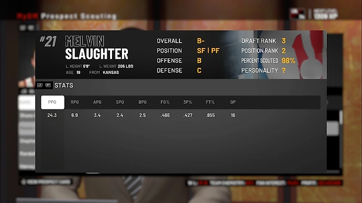Знакомьтесь, Мелвин Слотер. 19 лет, рост 6’9 футов, вес в 206 фунтов. Довольно универсальный игрок, хоть по защите слегка хромает. Большой потенциал, хорошие броски из – за дуги, атлетизм неплох, средняя персональная защита. Вот его данные за 16 игр.