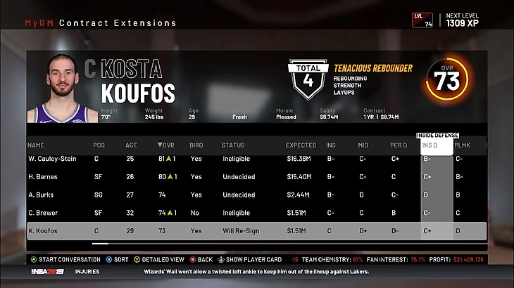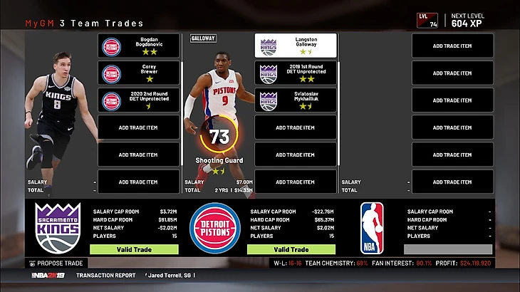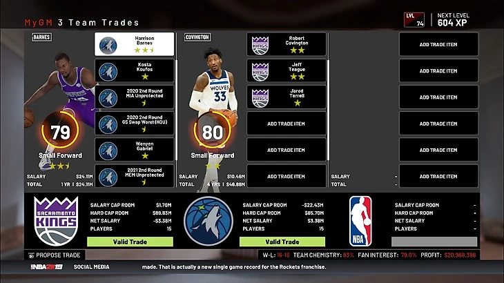 И вот он неплохой вариант: я получаю Ковингтона, хорошего опытного игрока на легком форварде на 4 года, большой контракт Тига на 2 года с функцией игрока и молодого игрока с неплохими характеристиками, но за это я отдаю Барнса, Куфоса, 2 пика второго раунда 20 года (из 4 возможных) и 1 пик второго раунда 21 года, а также бесполезного для меня новичка. В 2К19 я очень люблю Ковингтона. Крайне хороший 3&D игрок с хорошими значками, что поможет воспитать нового такого же игрока. Жертва в 3 пика очень велика, но такие уж ограничения – я вынужден идти на поводу у компьютера. Также обмен Барнса с его большим контрактом на Тига с его чуть меньшим контрактом не очень окажет роли на платежку команды. Так что, я соглашаюсь на данный обмен. Мне кажется, что Ковингтон приживется в системе Сакраменто. Но теперь я намерен обменять Богдановича, потому что он уже требует место в старте, а Ковингтон больше заслуживает места под солнцем. Именно из – за этого была провалена цель не давать ложных обещаний, потому что перед этим пообещал переставить Богдановича в старт. Что же, лишились 800 тысяч долларов, ничего страшного.