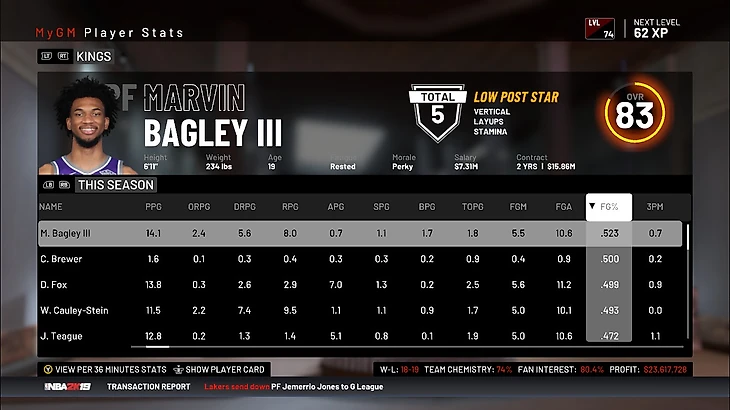 Вот и прошел экспериментальный декабрь. Команда идет с результатом 18-19. Богданович мне очень не нравится, он всегда оказывался хуже по статистике чем стартовый форвард, будь то Барнс или Ковингтон. В целом, баскетболисты ведут себя, как и раньше, схема немного раскрыла их атакующий потенциал, но и на защиту тоже повлияла. Бэгли стал намного лучше попадать, даже из – за дуги иногда попадает. У него много бросков с ближней и средней с очень хорошим процентом попаданий, что вполне обыденно для игрока его позиции. Но я хочу в межсезонье прокачать ему бросок. Он очень необходим, чтобы сделать его универсальнее.