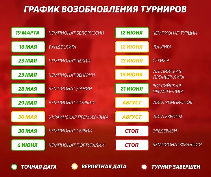 Ведущие спортивные лиги постепенно выходят из карантина, буквально несколько недель назад футболисты немецкой Бундеслиги к большой радости поклонников возобновили сезон, при этом все матчи проходят без зрителей как и ожидалось. После возобновления одного из топовых футбольных чемпионатов появились конкретные даты возвращения испанской Примеры (12 июня), Серии А (13 июня) и РПЛ (21 июня). В НХЛ решили доигрывать сразу с плей-офф, но точных сроков пока нет.