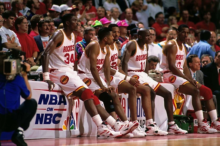 Мне хотелось рассказать о том, как с каждой новой Финальной серией появляется все большее количество старых-добрых персонажей, вращающихся в баскетбольных кругах и в наши дни. Это знакомство наоборот – мы знаем, кем они являются в наше время, и получаем возможность узнать, какими были эти персонажи в те времена. Порой встречаешь удивительных знакомых, которых никак не ожидал встретить. Вот на скамейке запасных Док Риверс – из-за травмы он не сыграет в Финале ни минуты, а ведь Никс так не хватало еще одного игрока задней линии в ротации; у Рокетс на скамейке тоже есть будущий тренер – Скотт Брукс не проведет на паркете ни минуты из-за своего уровня игры, но кто знает, возможно, его будущее как тренера было предопределено Руди Томьяновичем, выдающимся главным тренером Рокетс. Рядом с ним расположился Мэтт Буллард – нынешний, погрузневший комментатор матчей Хьюстона, тогда он — стройный двадцатисемилетний парень с модной прической, который должен был нести угрозу из-за дуги, выходя со скамейки запасных в качестве главного сменщика Роберта Орри – угроза была столь не опасной, что концовку серии Буллард просидел рядом с Бруксом. В следующем году Мэтта Булларда в стане Рокетс не будет.