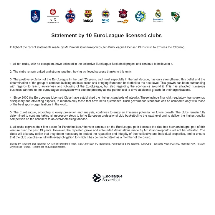 6. Все клубы выражают твердое желание, чтобы афинский «Панатинаикос» продолжил идти по пути Евролиги, потому что клуб был неотъемлемой частью проекта на протяжении последних 19 лет. Однако повторяющиеся серьезные и необоснованные клеветнические заявления господина Яннакопулоса не будут оставлены без реакции. Клубы примут все необходимые меры, чтобы защитить репутацию и целостность общих и индивидуальных ресурсов, а также, чтобы убедиться, что клуб полностью соблюдает все обязанности, которые возложил на себя как член группы.