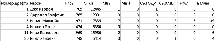 Для того, чтобы оценить драфт-класс определенным количеством очков, я ввел систему накопления баллов. Выглядит он так. Игрок получает 10 баллов за получение награды МВП в конце сезона, 5 - за включение в сборную года, 4 - за включение в сборную защиты, 3 - за титул чемпиона и 2 за попадание на матч всех звезд.