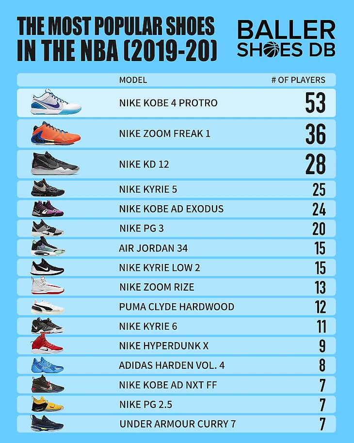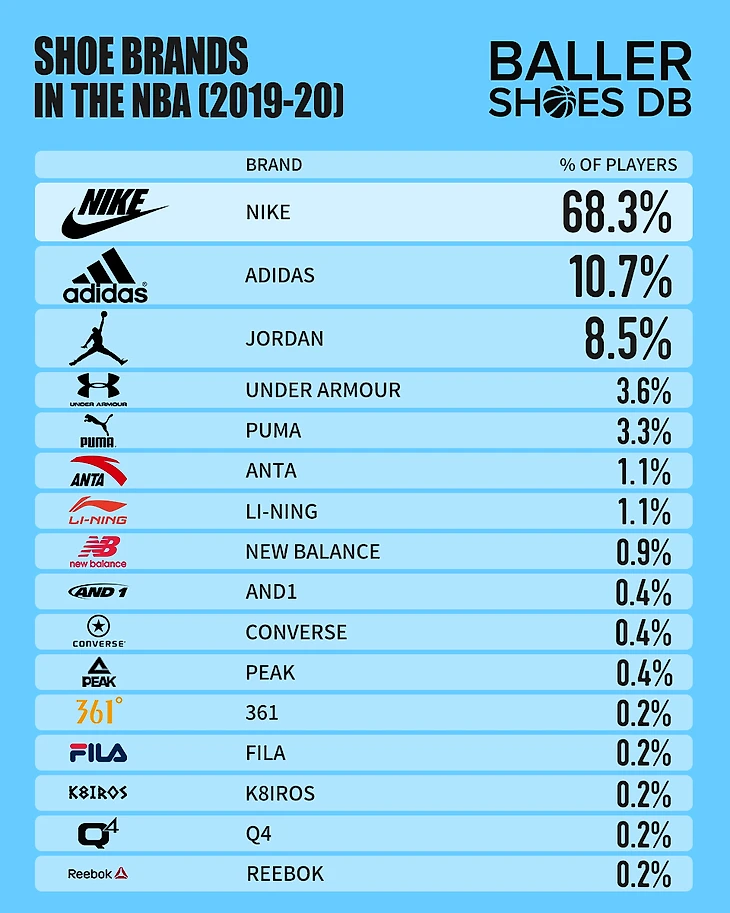 Nike, Nike и Nike. Коллаборации с Джорданом, Леброном, Дюрэнтом и Кобе завоевали для производителя большую часть рынка. В лиге скрипят найками почти 70% игроков. Пока Adidas после ухода из НБА теряет 7.3%, его долю и деньги забирают Puma, китайские Anta и Li-Ning и олдскульные производители.