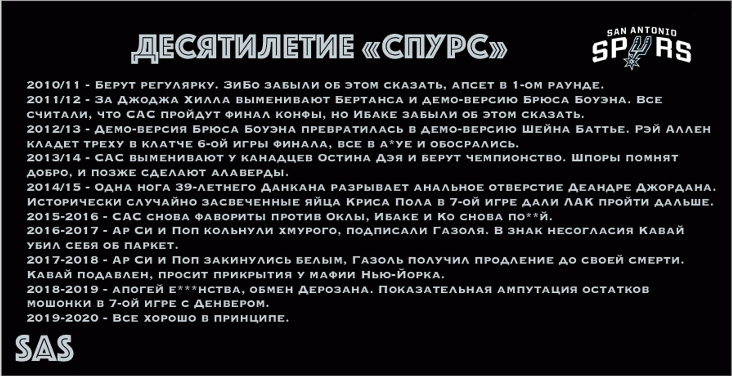 Инсайды за #триста – это вязкая жвачка с неизвестным рецепторам вкусом, которая прилипает к нёбу и вопит, что не слезет оттуда. Смиритесь и переваривайте эпичные факты прошедшего десятилетия НБА, обычно спрятанные от вас аналитиками за пеленой боксскора и всякой статистической галиматьи.