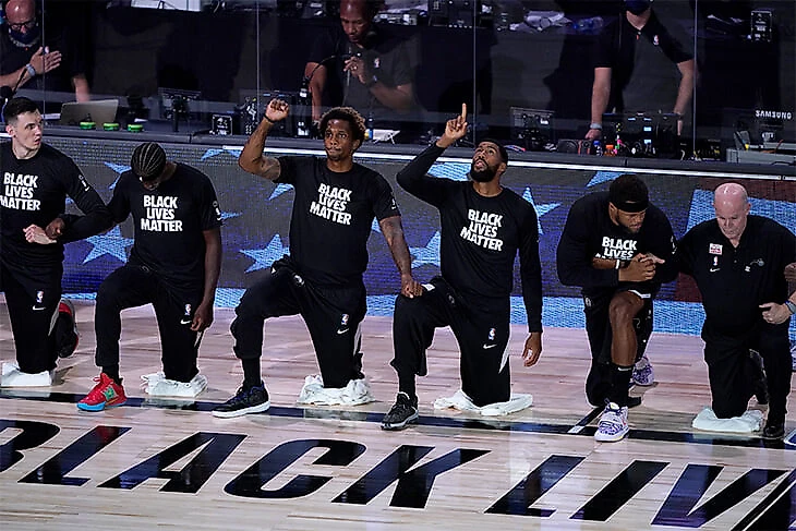 Исходя из всего этого, неслучайно, что НБА – лига, для которой лозунг «Черные жизни тоже имеют значение» наиболее актуален – в целом связала возобновление матчей с политической повесткой. Игроки опасались, что рестарт сезона приведет к тому, что спорт заслонит протесты против полицейского беспредела. И потому сделали все, чтобы эта тема была максимально инкорпорирована в баскетбол. Игроки опускаются на колено при звучании гимна (каждый, кто этого не делает, обосновывает свою позицию), выступают в майках, на которых нанесены не их имена, а призывы к равноправию или улучшению системы образования, сводят многие интервью к обсуждению расовой дискриминации или полицейского насилия, призывают идти на грядущие выборы, а лозунг «Черные жизни тоже имеют значение» присутствует везде, от клубных автобусов до масок.